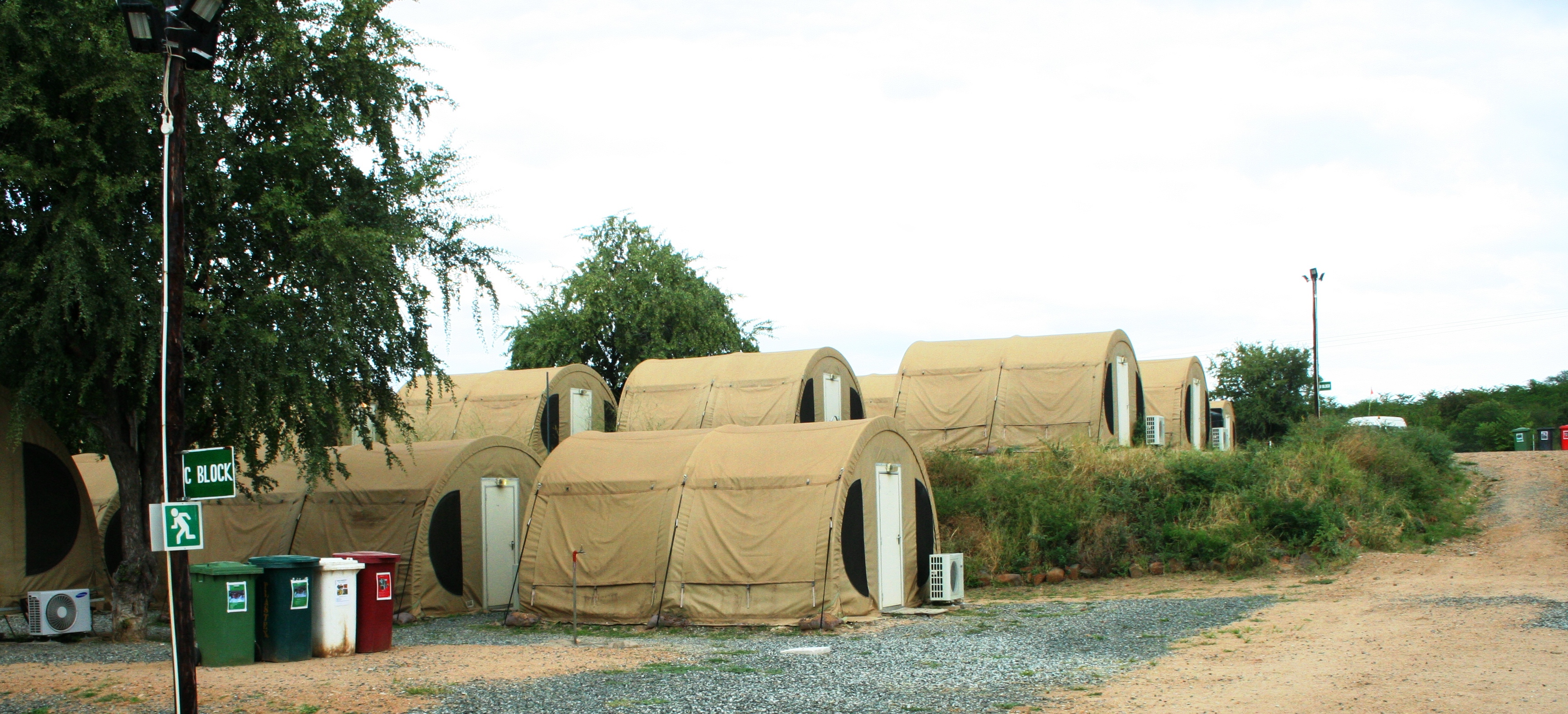 The Warrior shelter is a 4.8m wide barrel shaped “weatherproof” shelter, with a mild steel frame, covered with a durable UV resistant and waterproof PVC cover. The shelter has a long life expectancy and comes standard with roof insulation and windows. There are two standard sizes available and the shelter is customizable. The windows are fitted with inner outer, clear PVC and sewn-in mosquito netting.