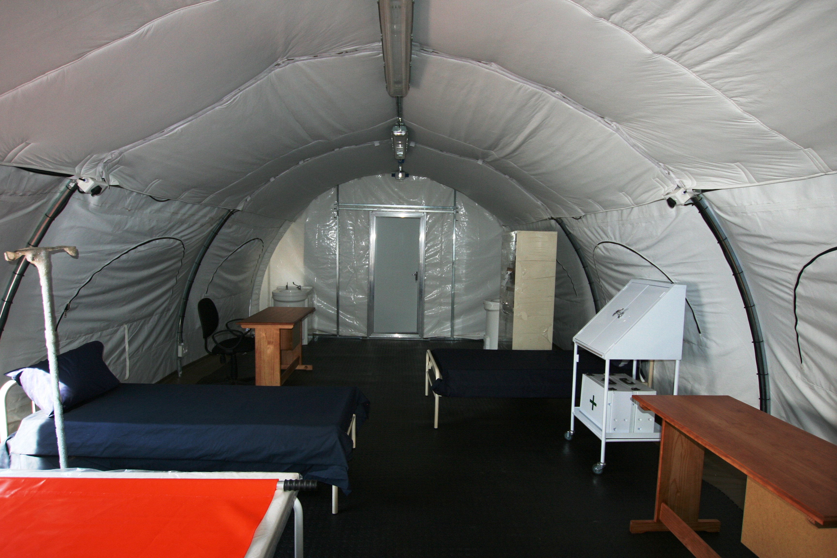 A multifunctional inflatable shelter with inflatable arches and no vertical supports, allowing for a clear floorspace. It has a rapid erect feature, ideal for disaster and medical support situations.